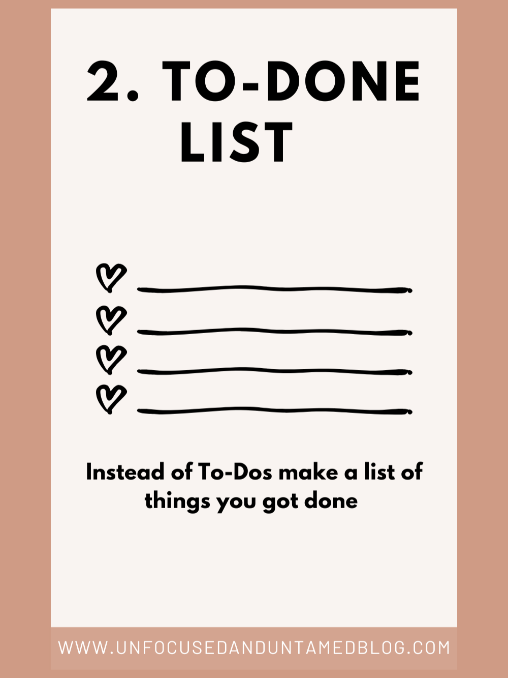 Instead of allowing yourself to be guilted by all the things you didn’t finish, make a list of the things you got done. Even the little stuff counts! Dishes are done, e-mail in box is cleared, laundry is put away.
